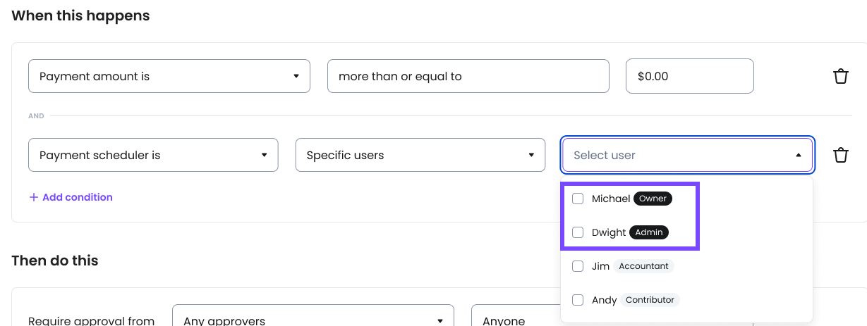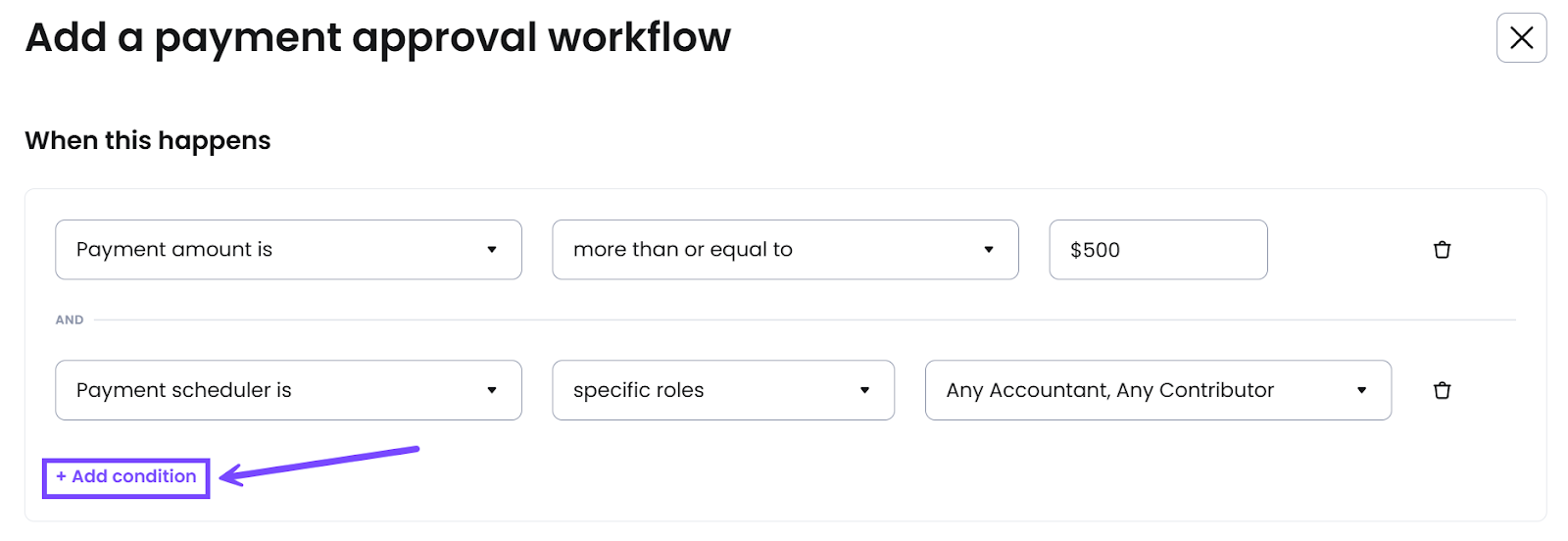 3 - To combine rules (e.g., "Payments over $500" AND "Scheduled by any Accountant"), select + Add condition.