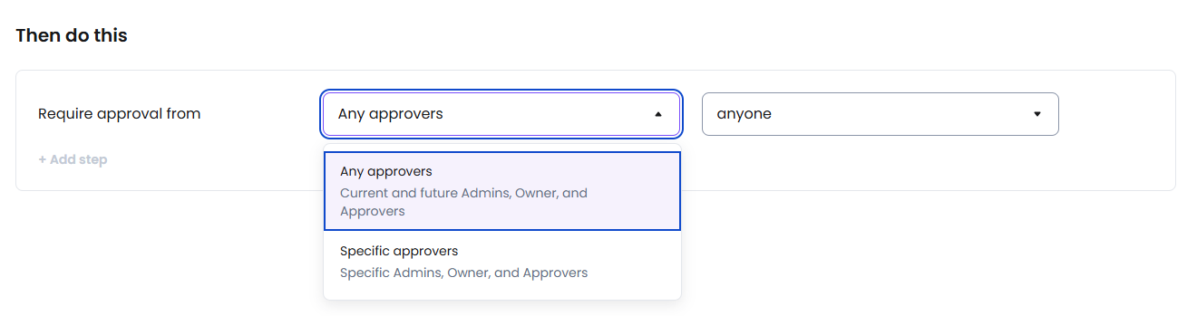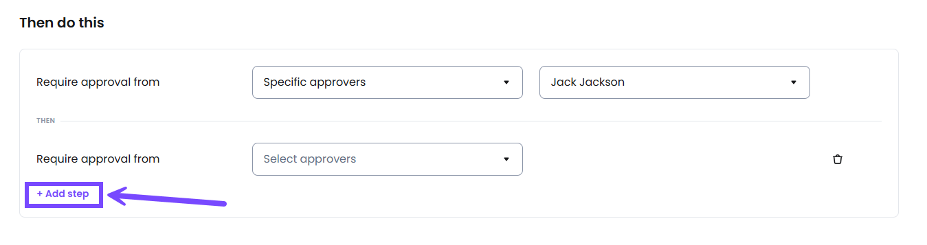 Boost and Unlimited subscribers can set up multiple specific approvers. For a hierarchy, select + Add step to add the next level of approval (up to 3 levels).