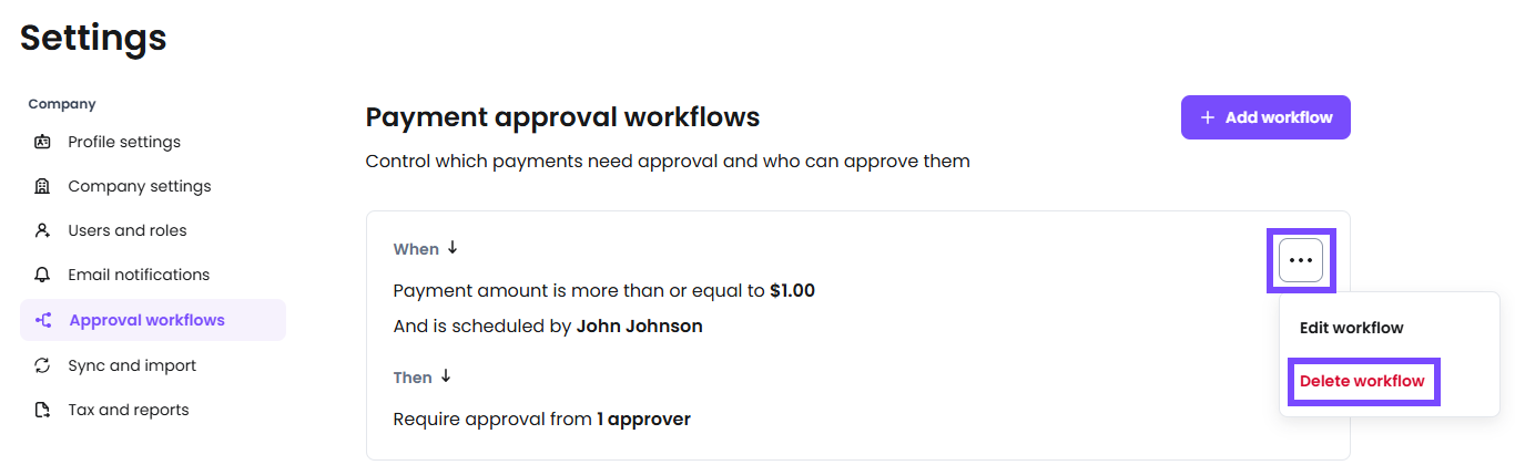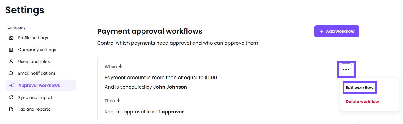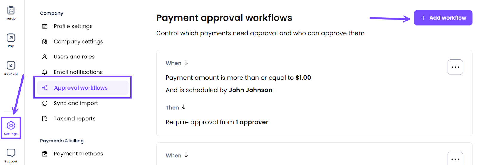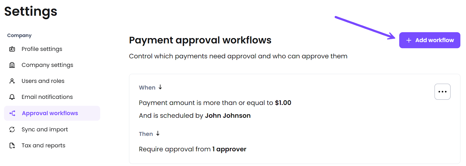 That's it! The new workflow will appear in the Approval workflows settings. The company Owner and Admins will be notified of any new payments.