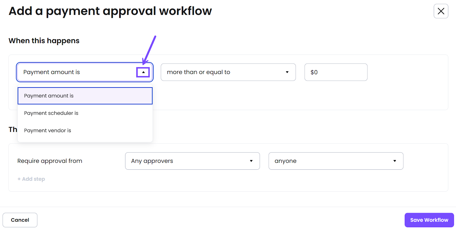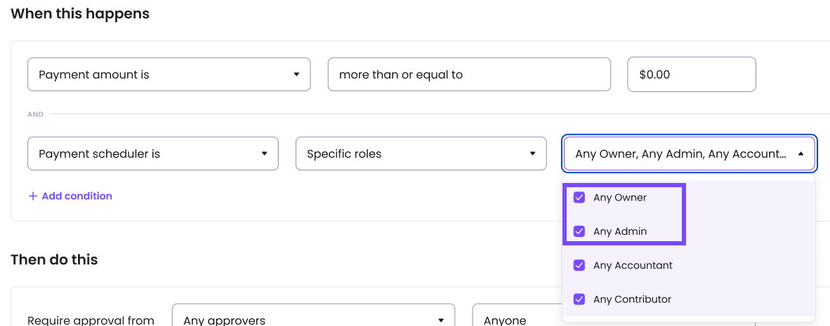 - Admin/Owner exemption: If a workflow is based only on Amount or Vendor criteria, it will only apply to Accountants and Contributors. To require approval for payments scheduled by an Owner or Admin, you must explicitly select them (either as specific users or by selecting the "Owner" or "Admin" role) under the Scheduler criteria.