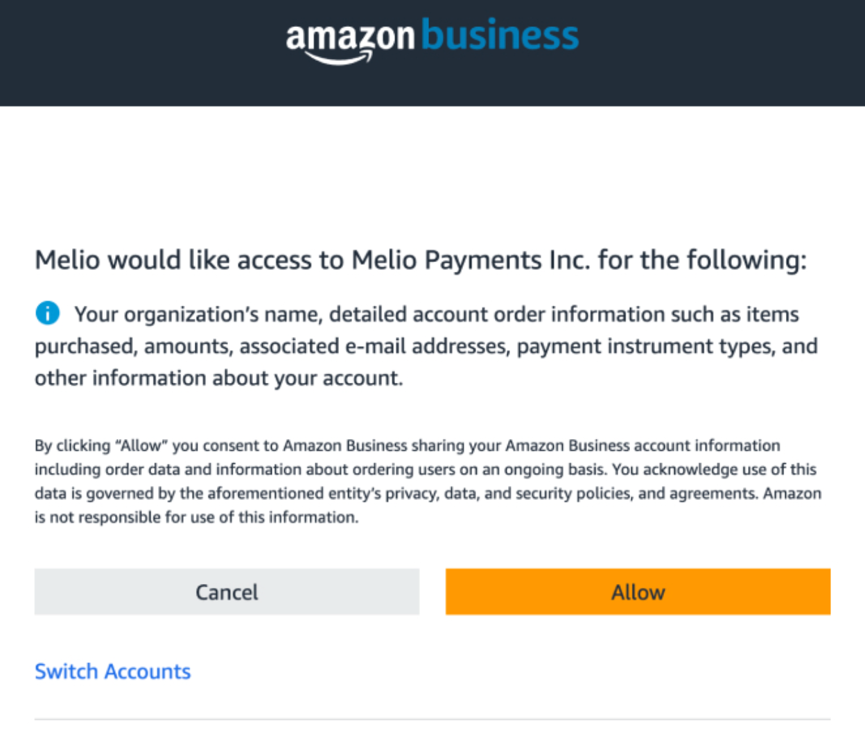 6- Continue to allow Melio to access your Amazon Business account. Connecting might take a minute.