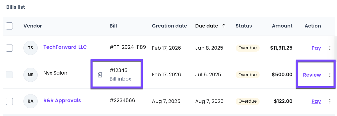 10- New bills imported from your Amazon Business account will appear in the Bills tab and are marked as Review in the Action column, so you can easily identify which bills still need to be checked.