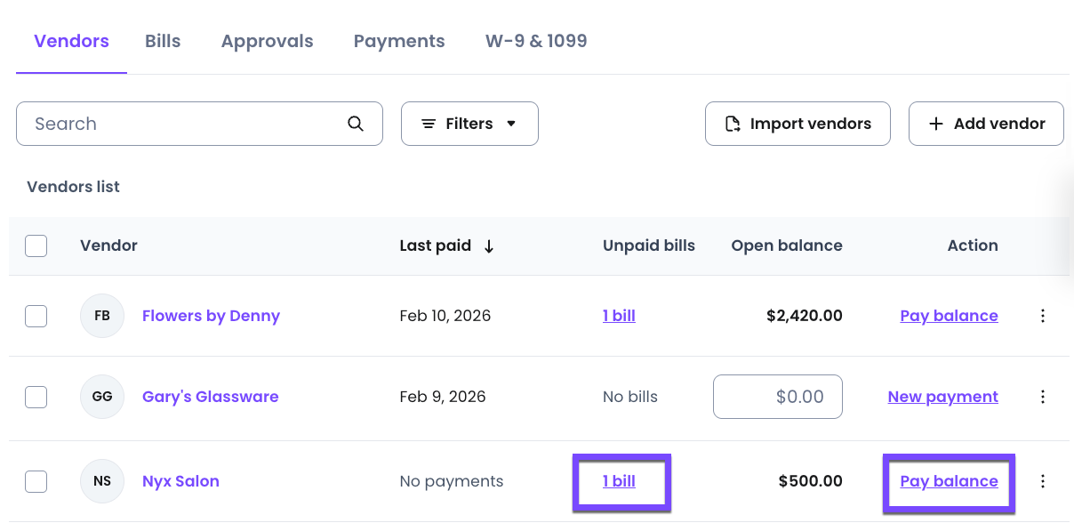 You can also find these imported Bills listed with the vendor under the Vendors tab. You can select the bill listed under the Unpaid bills column or select Pay balance.