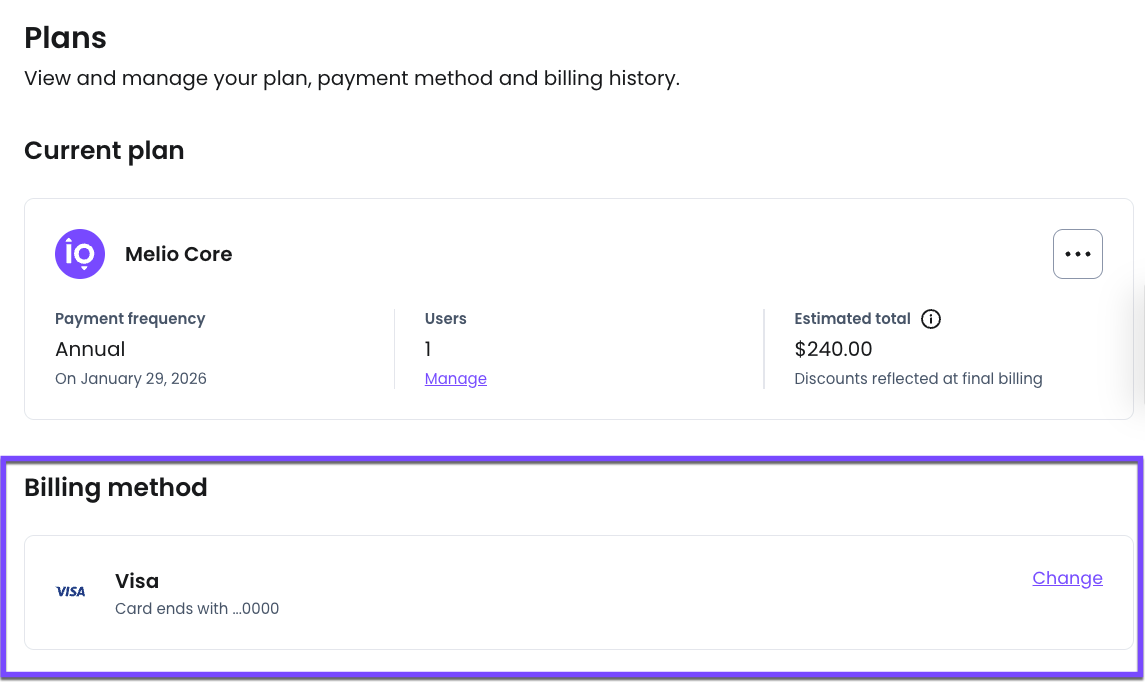 When you subscribe to Melio, you add a billing method to cover your subscription fees. This can be a card or a bank account.