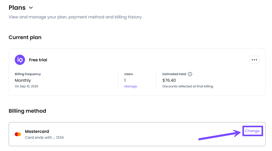 4 - In the Billing method section, you’ll see the current payment method for your subscription.