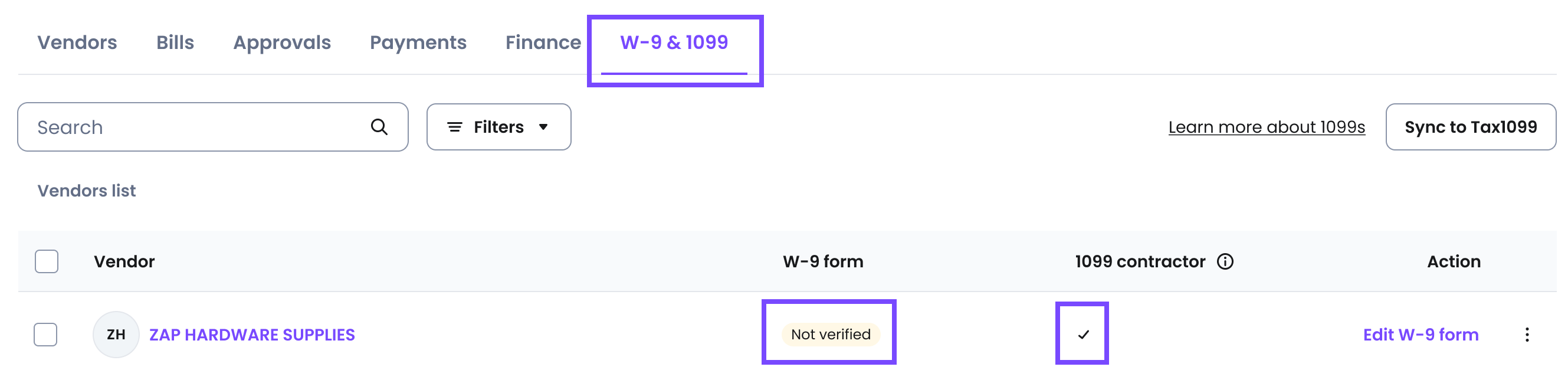 2 - This will open a W-9 & 1099 tab filtered to show 1099 contractors who have not verified a W-9 form.