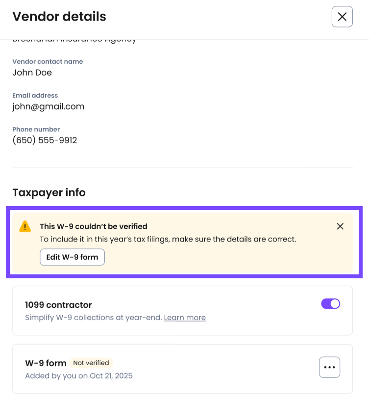 To confirm that the vendor indeed has not verified a W-9 form, you can select the vendor and check the Taxpayer info section. A warning banner will be visible here if the vendor’s details were not verified.