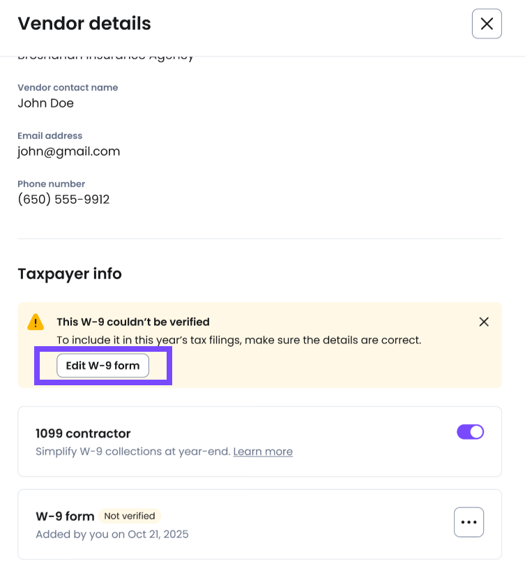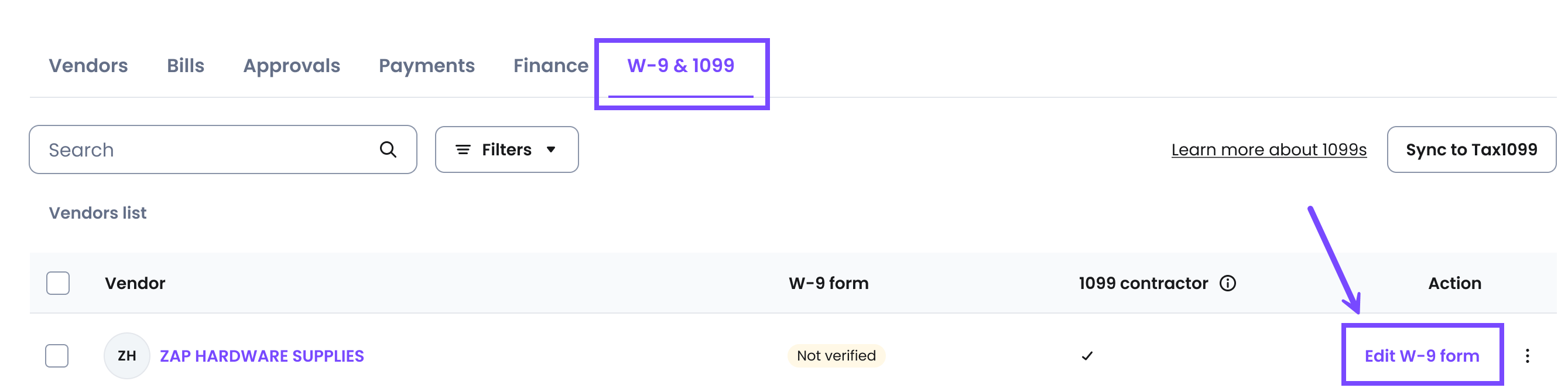 Alternatively, you can open each vendor, go to the Taxpayer info section, and select Edit W-9 form under the yellow warning message.