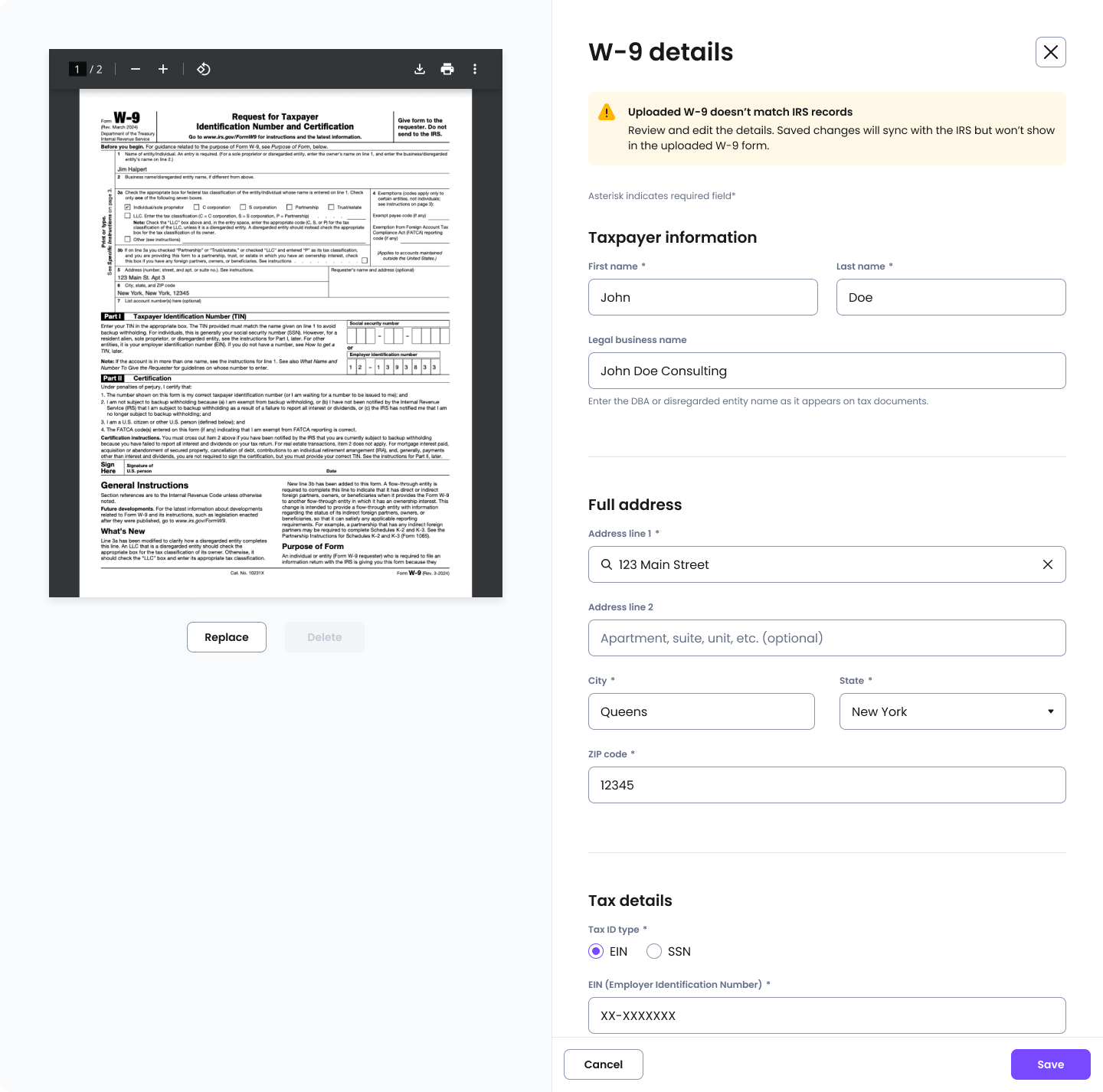 2 - On the next screen, you can see the uploaded W-9 form and change the relevant fields: