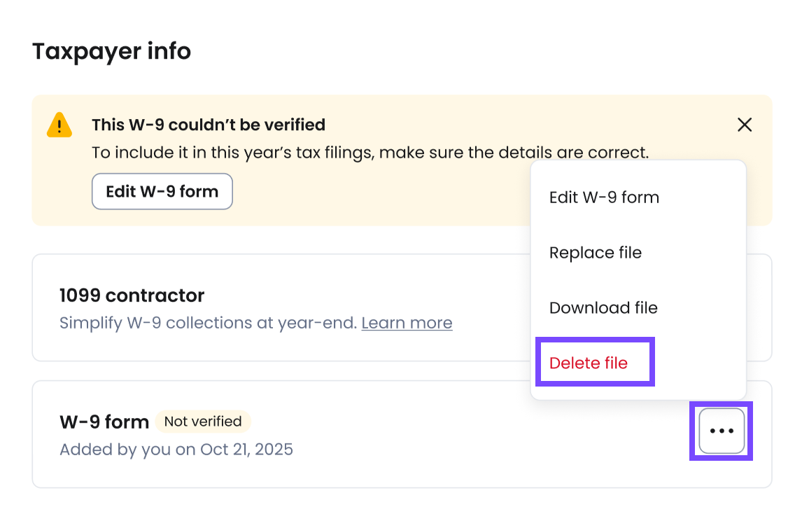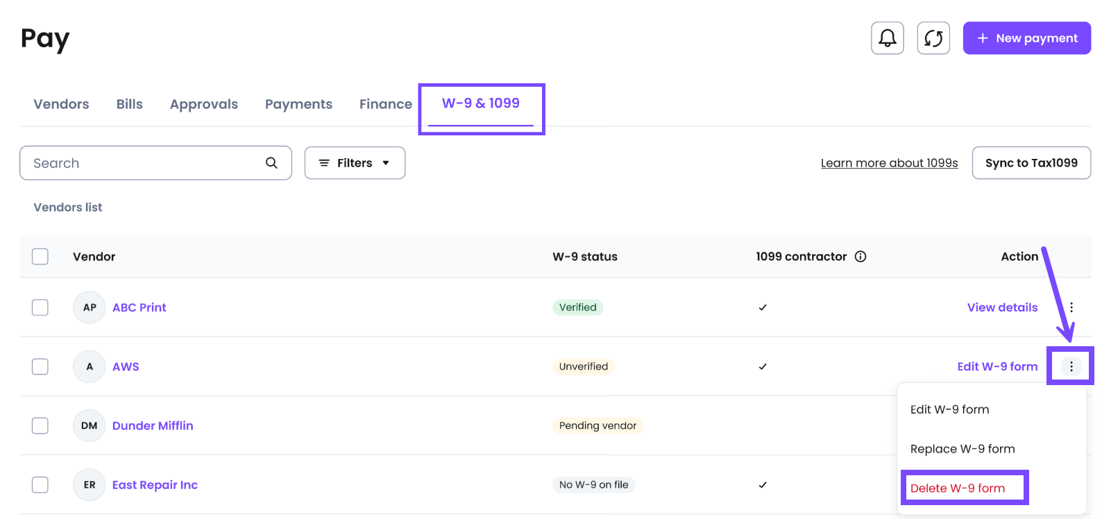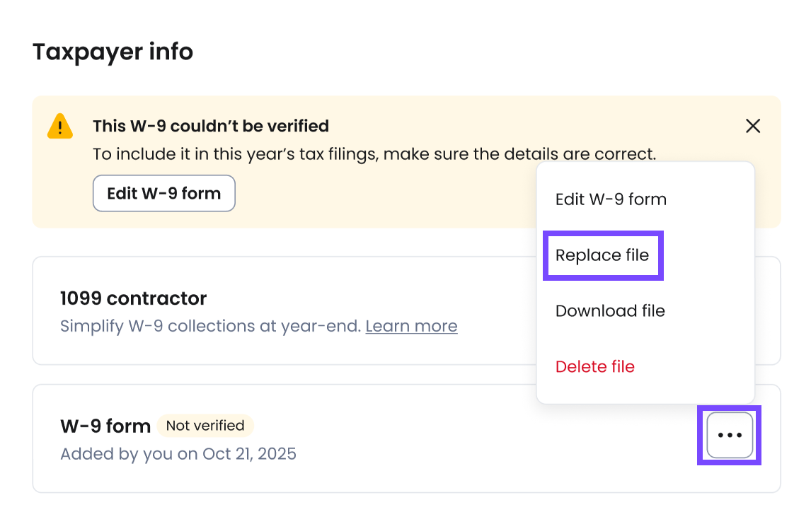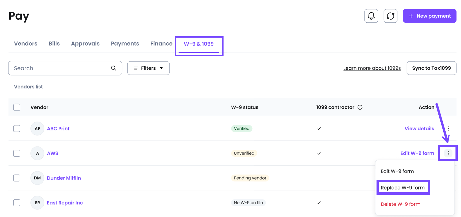 1 - From your W-9 & 1099 tab, select the three-dot icon next to the vendor you wish to replace the W-9 form for. Then, select Replace W-9 form.