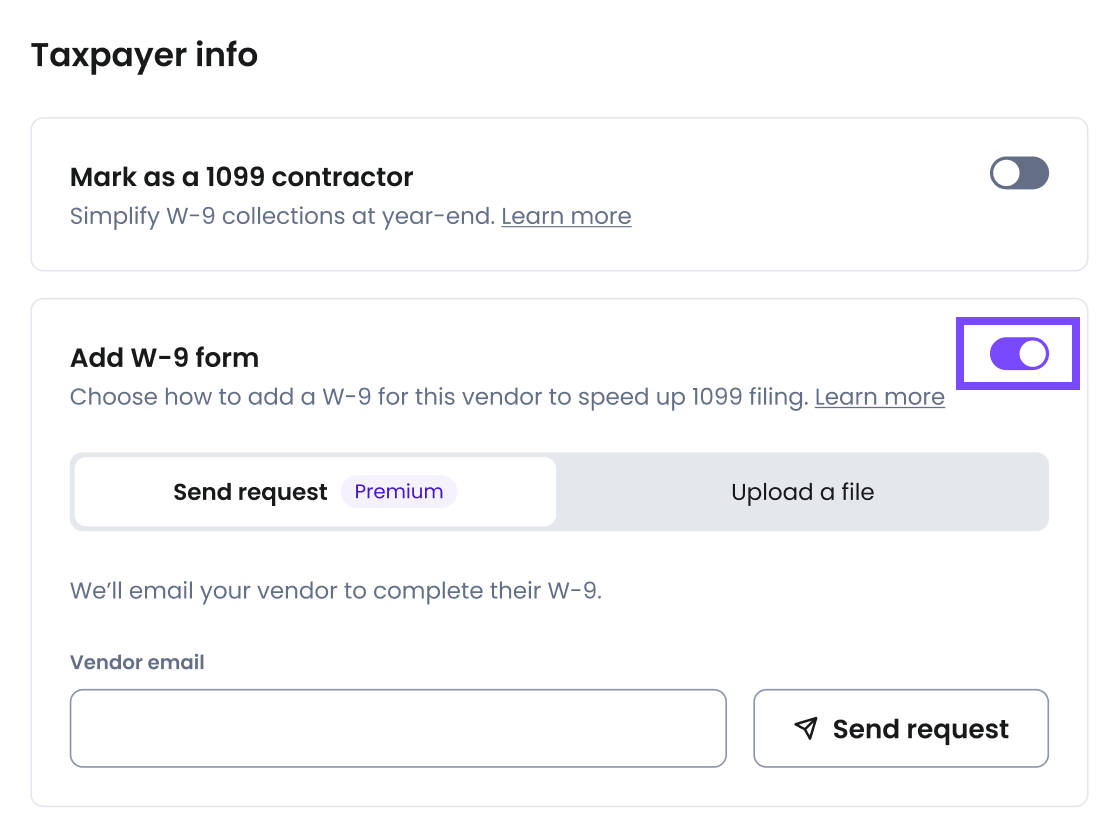 2 - Now you can request a new W-9 form from your vendor or upload it later. Switch the toggle next to Add W-9 form and proceed with the desired action.