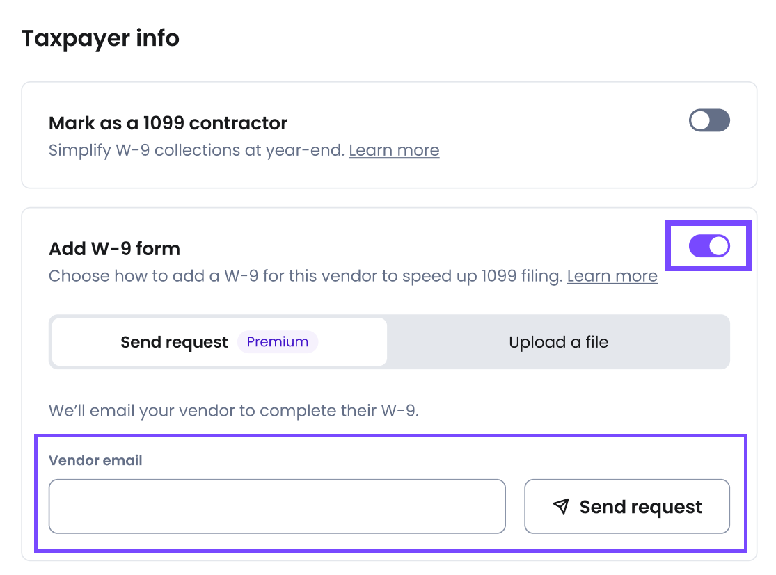 1 - Select the desired vendor, and, in the Taxpayer info section, switch the toggle next to Add W-9 form.