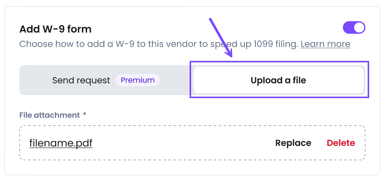If a vendor has already sent you a completed W-9 form (in PDF, PNG, or JPEG format), you can upload it to their profile in Melio.