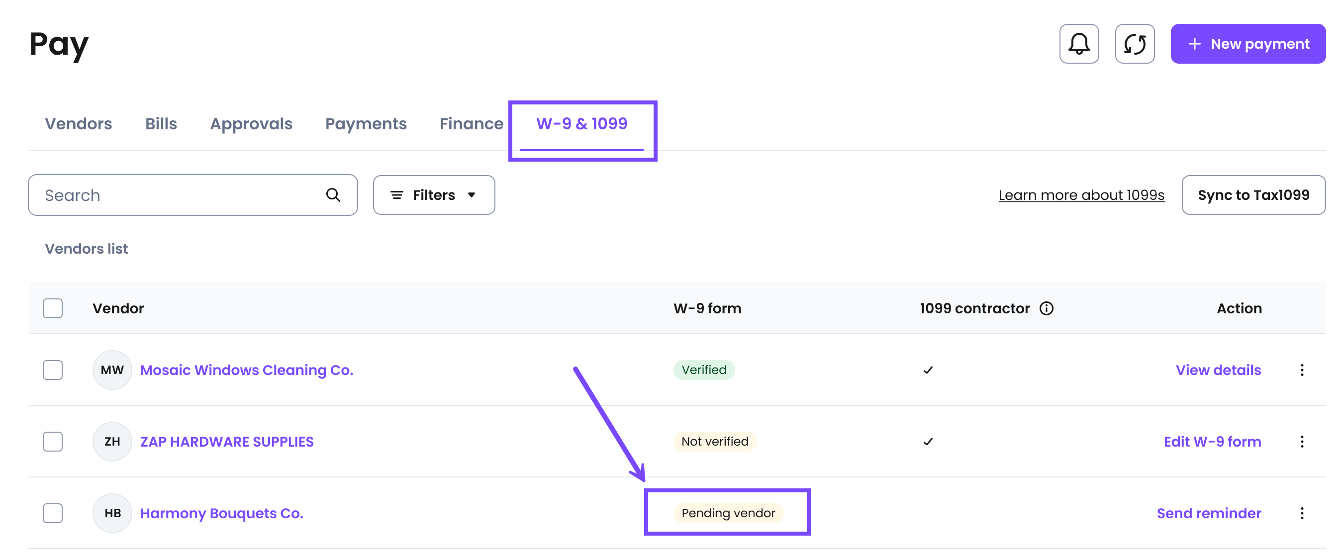 2 - Look for the vendors with W-9 status as “Pending vendor” or “No W-9 on file”. You can use the Filter button for it.