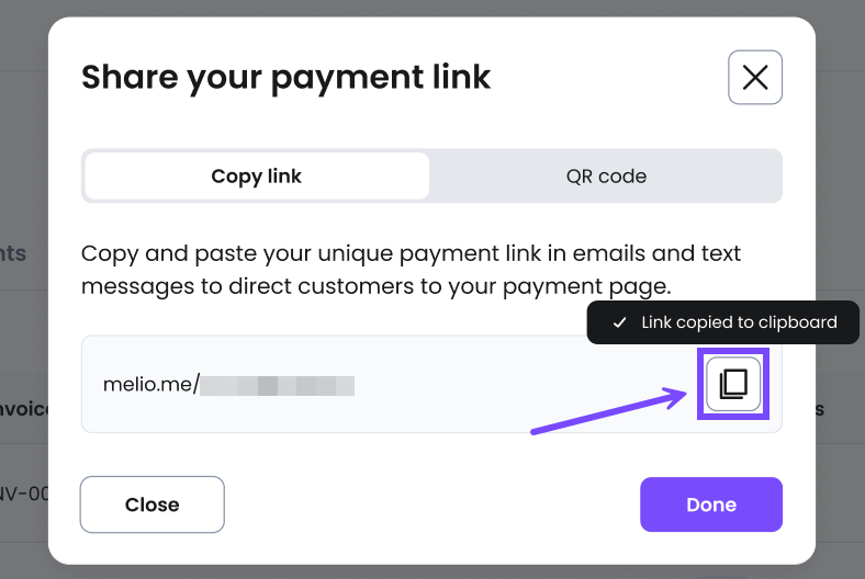 - A payment link connected to a specific invoice in your Melio account: You enter the amount and other payment details for the customer. Creating an invoice is required.