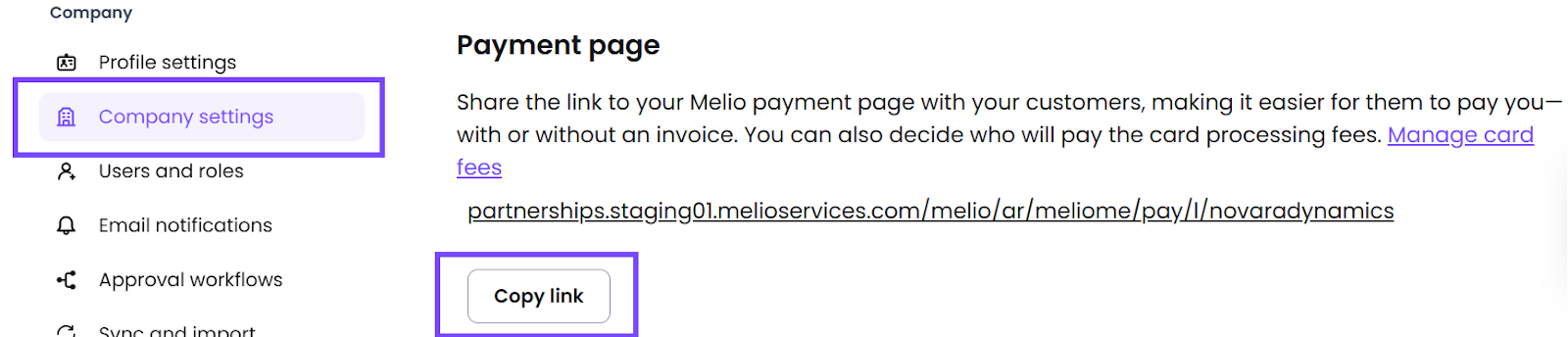 Alternatively, you can find your payment link in the Company settings and copy it from there, as shown below.
