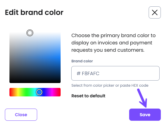 - Brand color: Select the background color that your customers will see on the payment page. Then, select Save.