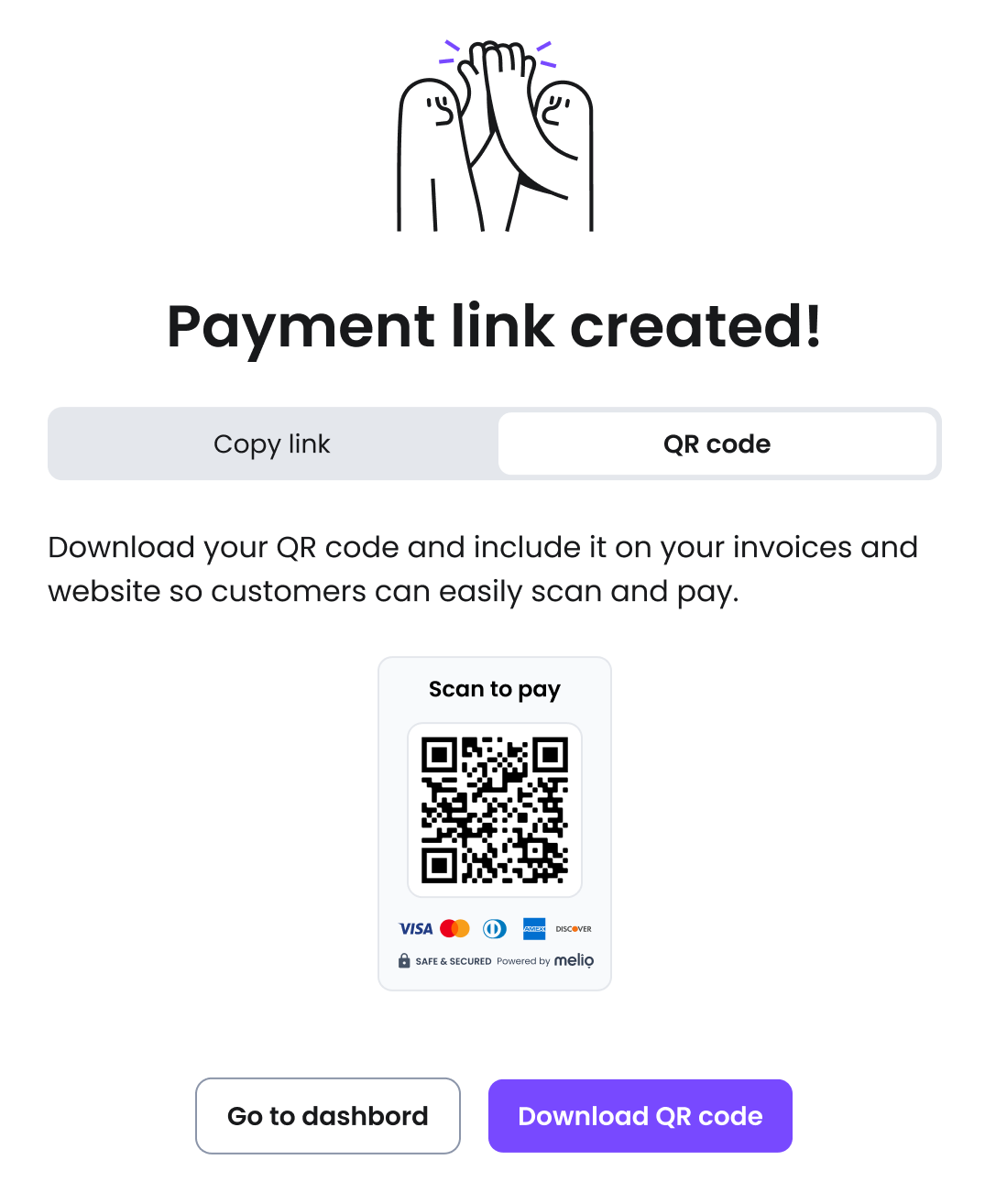 - Use a QR code: We've generated a convenient QR code for you. It can be used on your printed materials, packaging, business cards, etc. Your customers can simply scan this code to access your payment link.