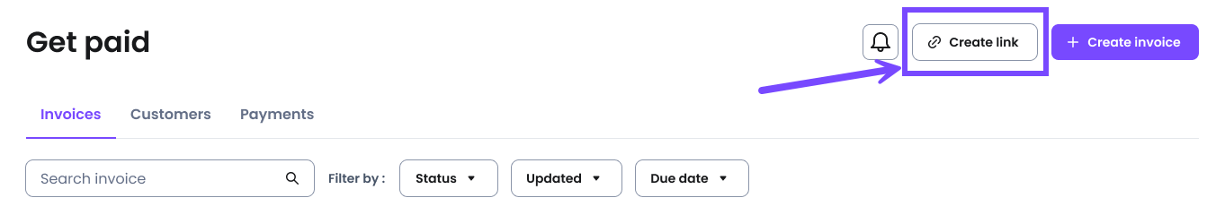 2 - Select Create link at the top right of the Get Paid dashboard.
