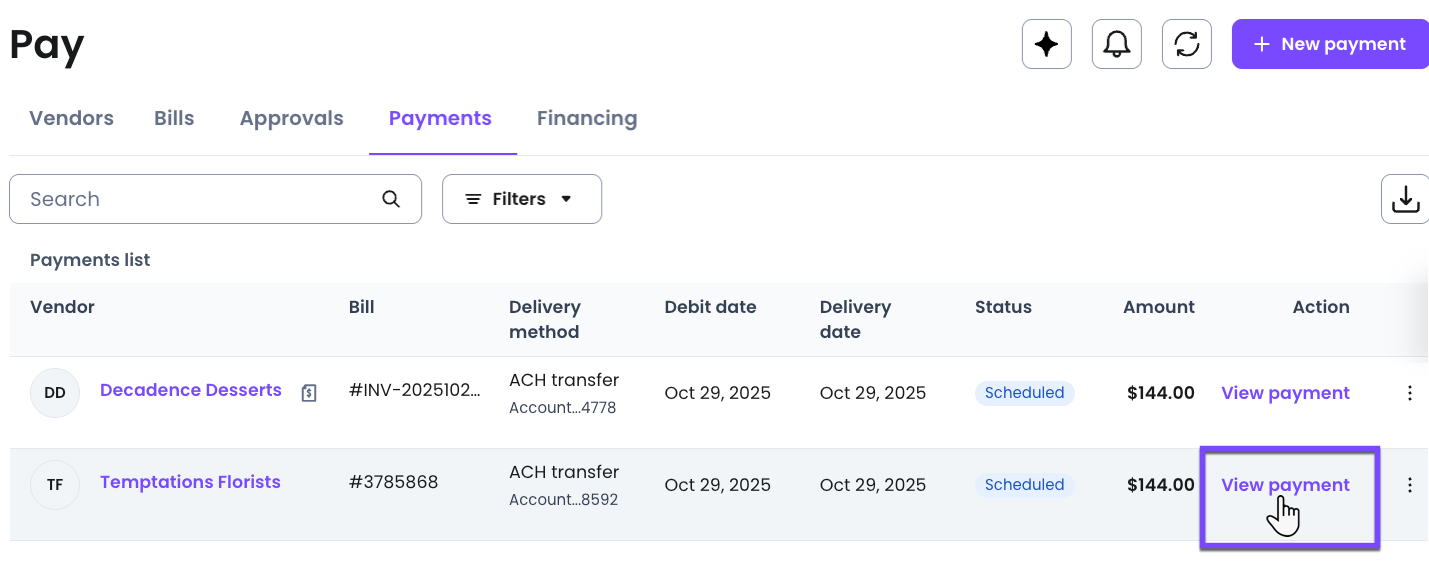 4- Find the desired payment. Select the payment to open the Payment details. Alternatively, you can select View payment.