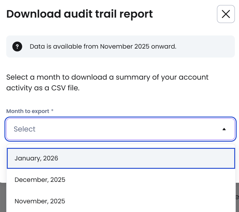 Audit trail reports are generated monthly, with records available starting from November 2025. Reports for the current month include all data from the first of the month up to the present day.