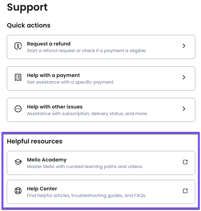 The Support Hub is your go-to resource for resolving payment issues, getting help, and finding answers — all from within your Melio account. Select the Support iconto get started.