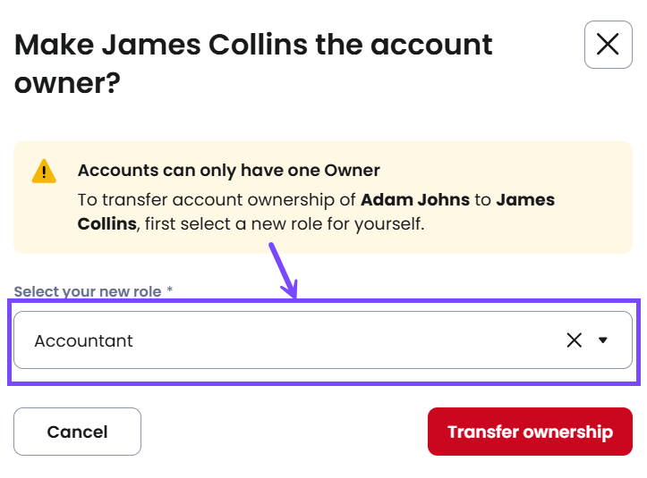 7 - A pop-up window will appear asking you to select a new role for yourself and confirm the change. Select Accountant as your new role from the drop-down list.