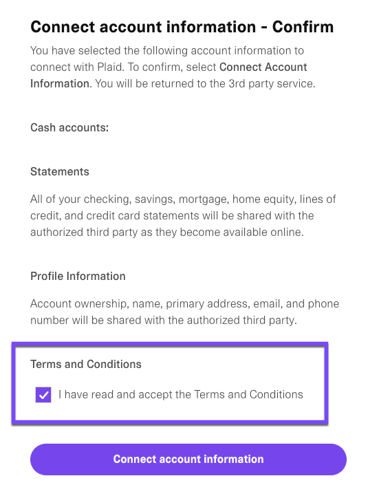 14- Under Terms and Conditions, check the box to accept them and select Connect account information.