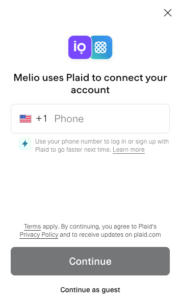 5- You will now be prompted to link your bank account through Plaid. The Plaid pop-up will open. Enter your phone number and select Continue. Your phone number is needed for two-factor authentication.