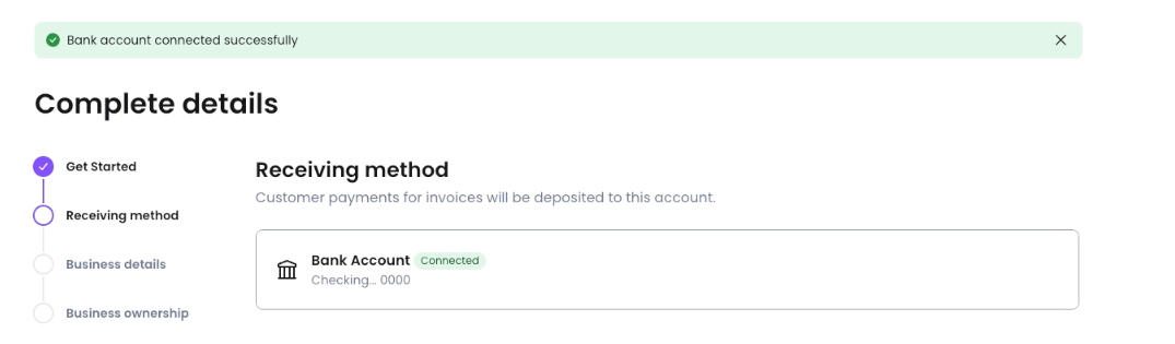 4- Next, you will need to add a bank account. This is the bank account where you would like to receive customer payments. To add a bank account, select the Add bank account button.