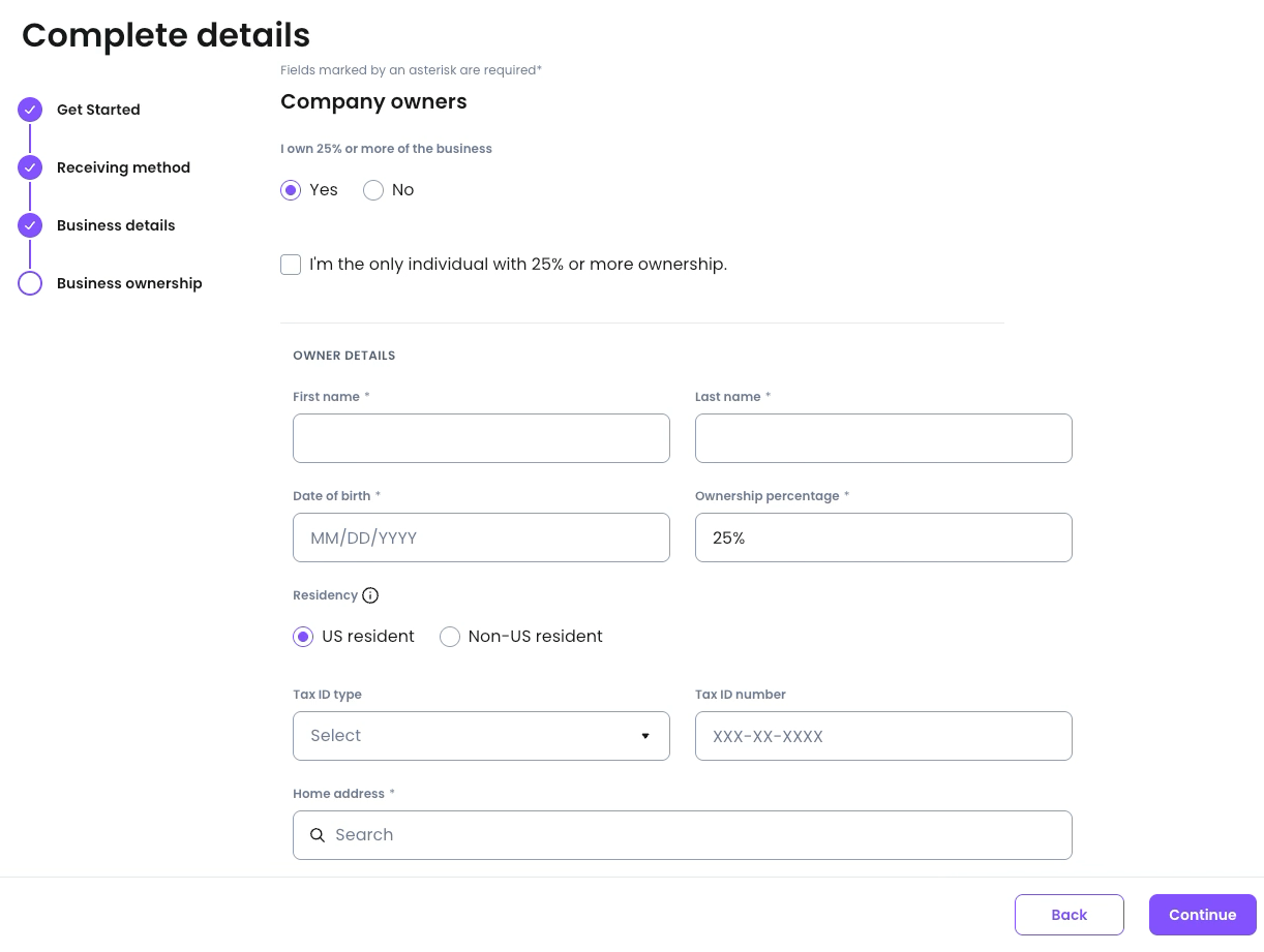 18- Next, enter your business details. These business details will differ depending on the business entity type. They generally include owner details, basic tax information, business address, etc.