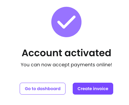 21- Once you have entered these details, your account will be activated, and you will be ready to accept payments online. Select Go to dashboard to return to the Get Paid dashboard. To start creating a new invoice, select Create Invoice.