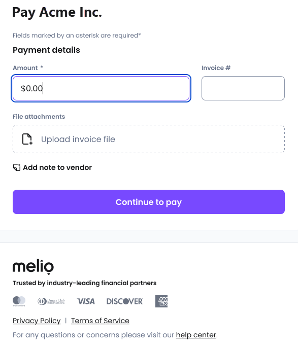 This link offers more flexibility for your customer, allowing them to provide payment details themselves. It's useful for situations where you don't have a formal invoice in Melio yet, or your customer needs to specify details like the amount or an invoice number.