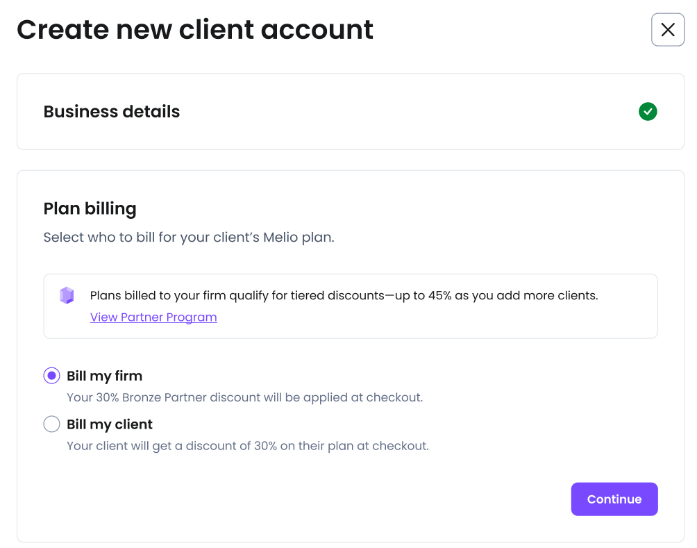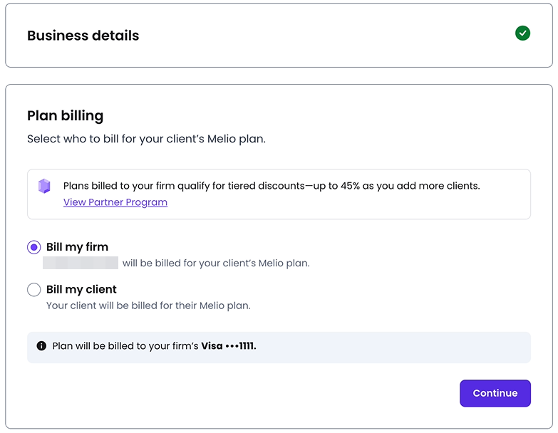 9 - Select who to bill for your client’s Melio plan and select Continue.