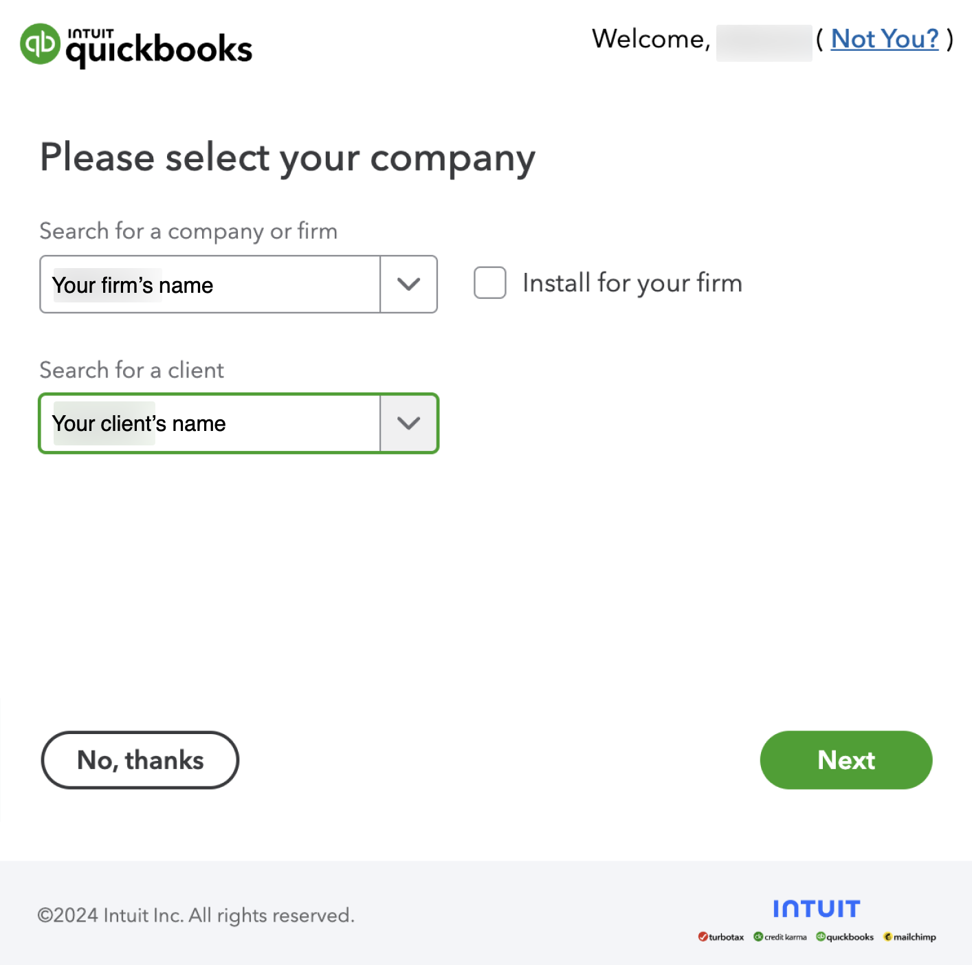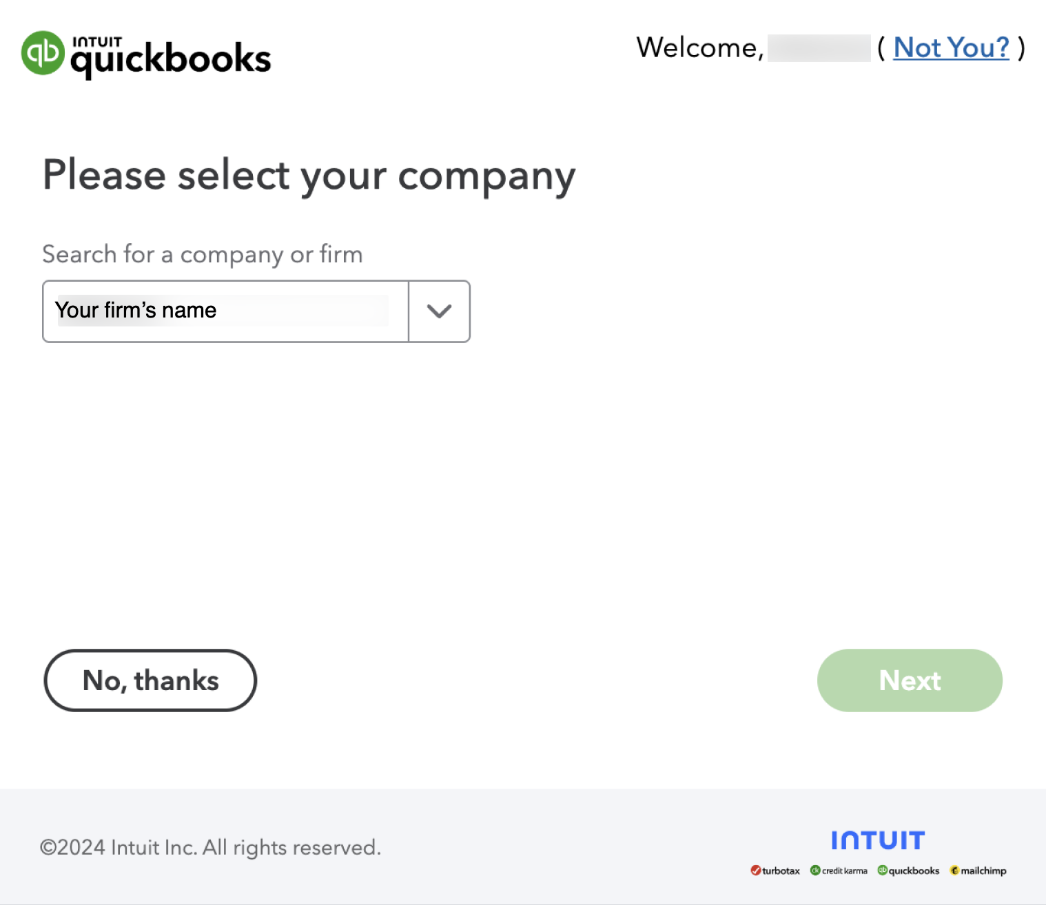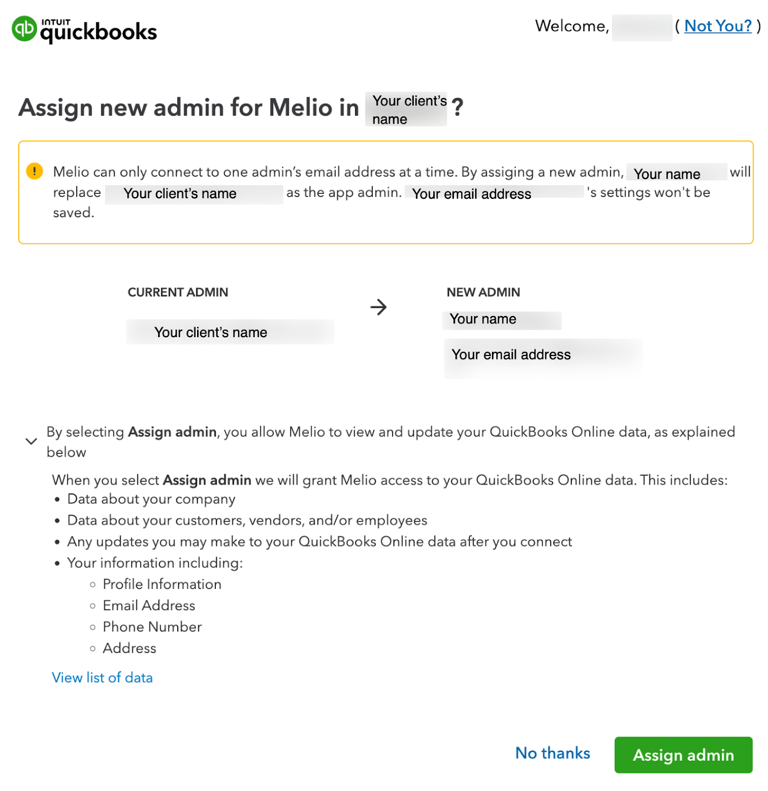 If your client’s QuickBooks account is already connected with Melio, you will see the Assign new admin for Melio page in [your client’s name].