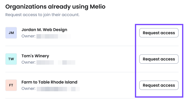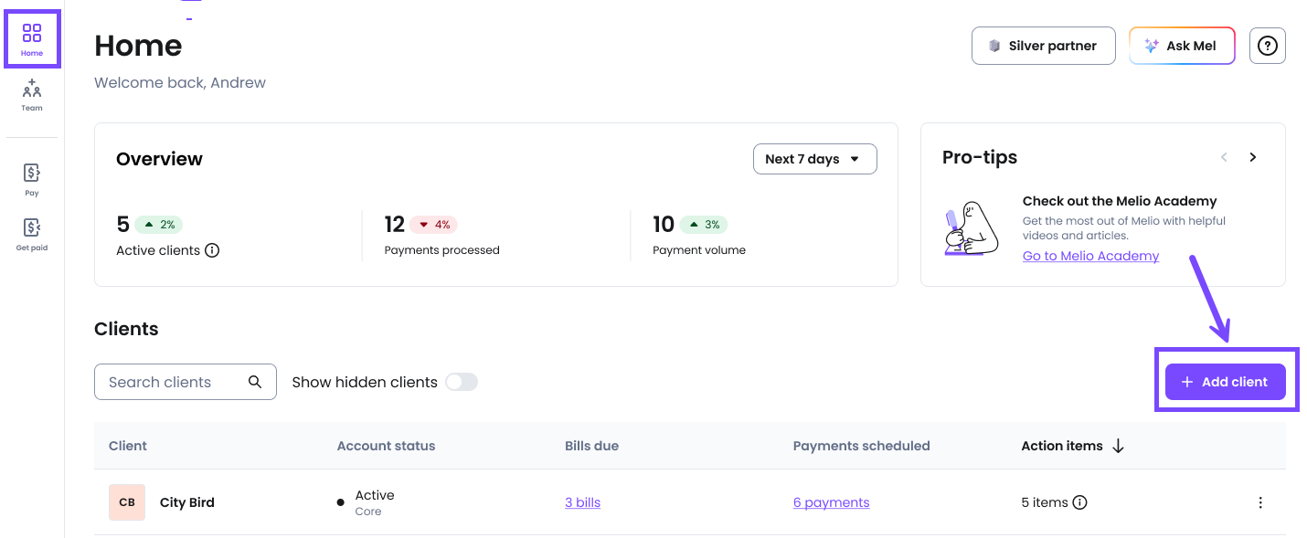 If your client already has a Melio account, you cannot add them to your dashboard immediately. You must first request access from the business owner: