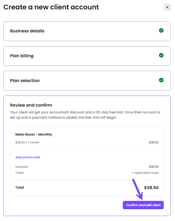 12 - Review all the details. If everything is correct, select Confirm and add client.