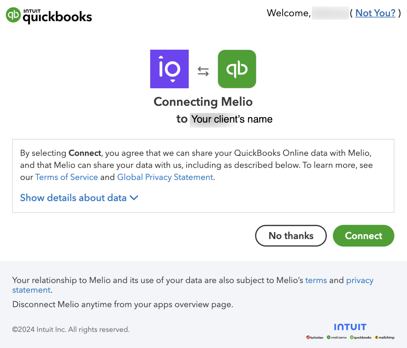 7 - Select Connect to connect Melio to your client's QuickBooks Online account.