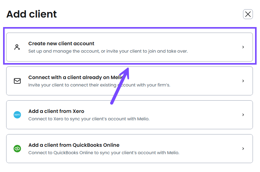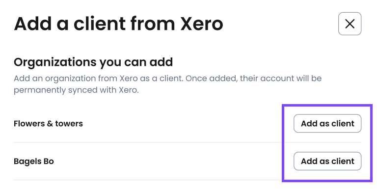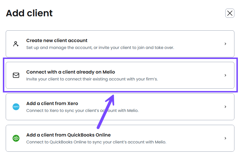 If you manage several clients within Xero, you can choose exactly which ones to bring into Melio: