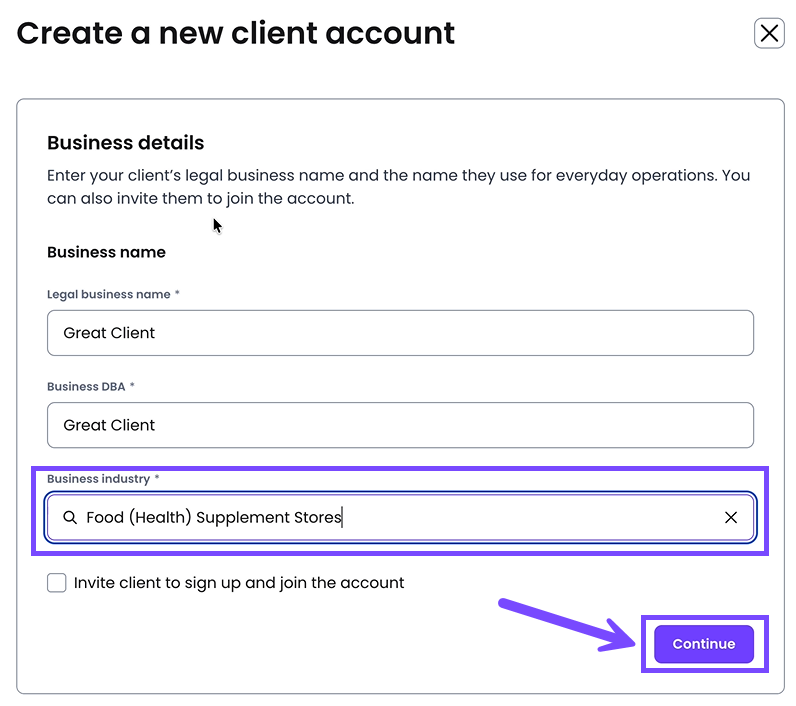 - Once your client accepts your request, their business will become available, and you can start making payments on their behalf.