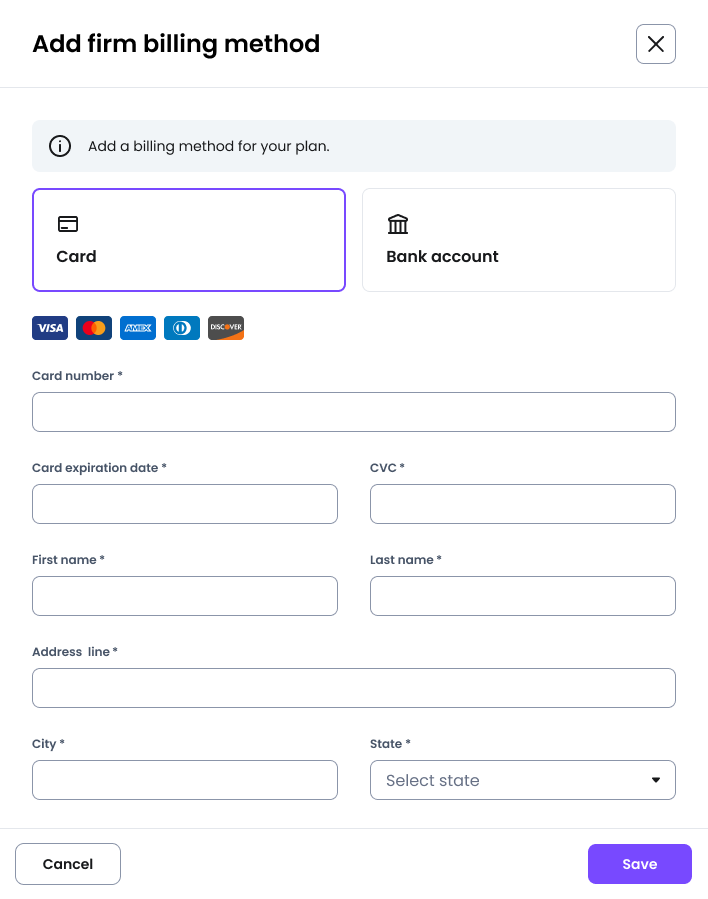 If you don’t have a billing payment method yet, you’ll need to select the firm’s payment method (card or bank account).