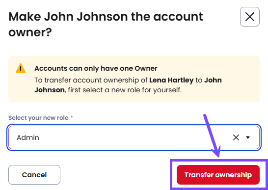 If the user you want to make the new owner isn’t already in your users list, you need to invite them first. They’ll need to accept the invite before you make them an owner.