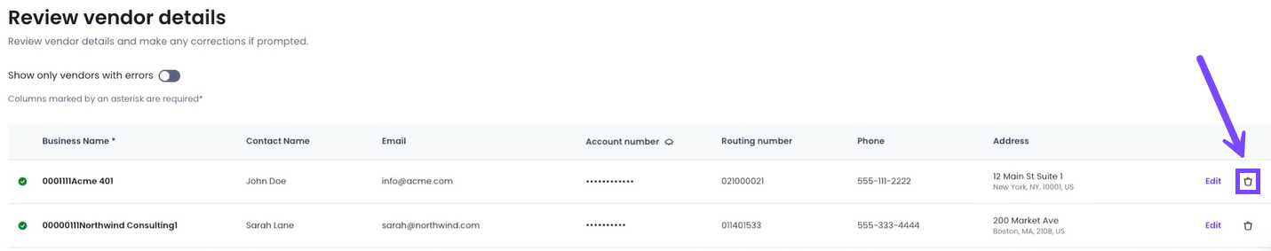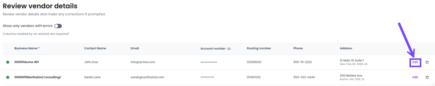 That’s it! The vendors have been uploaded successfully to your Melio account. You will now be redirected to the Vendors tab.