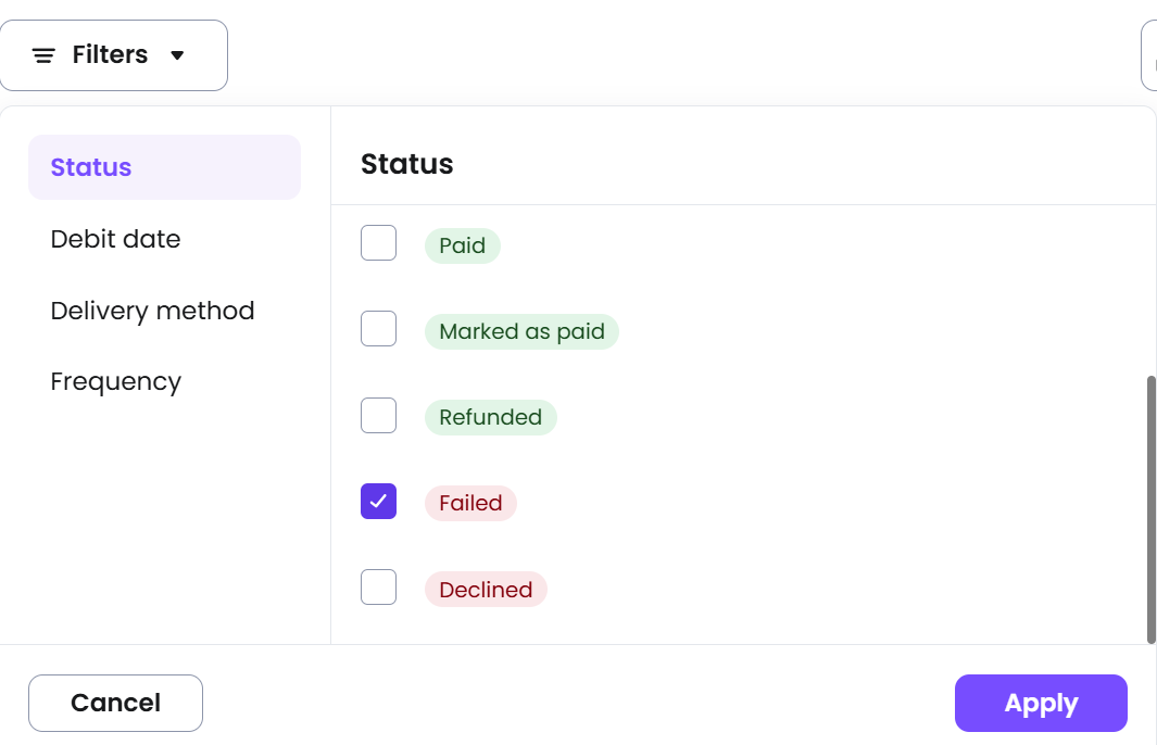 Please note: For easier access, you can filter the payments by status and select only failed payments.