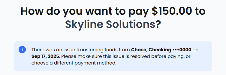 - Resolution: Make sure you have sufficient funds available and then reschedule the payment.