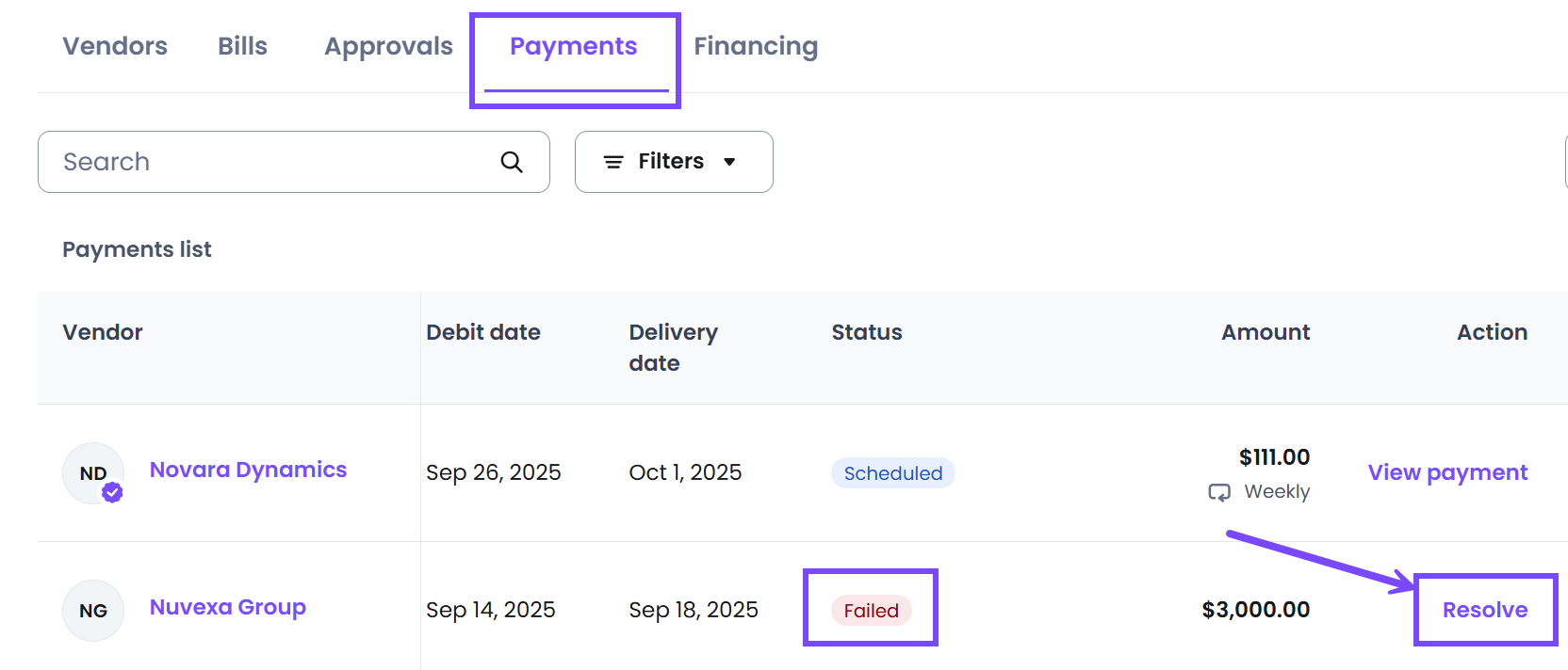Alternatively, you can log in to your Melio account, open the Payments tab, find the payment with the red Failed status, and select Resolve.