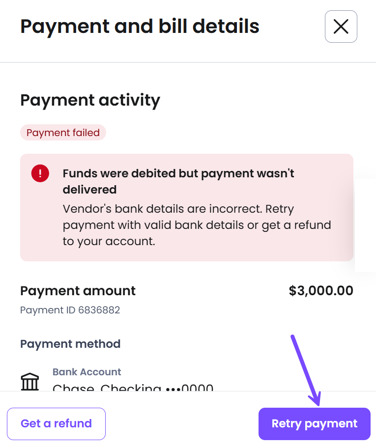 1 - In the Payment and bill details on the right side of the screen, you will see the reason why your payment couldn't be delivered. At the bottom of this section, select Get a refund.
