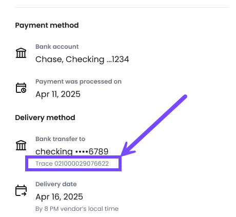 - After the payment is settled, a trace number will appear in the Payment and bill details window. This is the number that the receiver’s bank can use to help locate the funds.